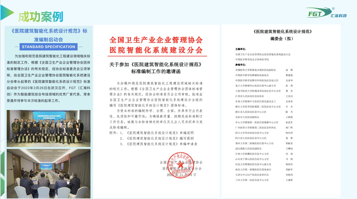 然後由彙海股份的苌總、吳總和浙江辦王總帶領下參觀了我們FGT綜合布線的智慧互聯未來(lái)體(tǐ)驗中心。這裡(lǐ)公司的所有榮譽獎狀、證書(shū)和專利榮譽牆一一在列,來(lái)訪專家對我們的産品陳列櫃和萬兆銅光(guāng)纜數字機(jī)房(fáng)解決方案展示區産生(shēng)了濃厚的興趣,非常細緻地了解我們針對未來(lái)數字智慧醫院的建設意見(jiàn)。非常湊巧前幾天苌總正好參加完全國(guó)《醫院建設智能化系統設計(jì)規範》标準編制啓動會的評審和定制工(gōng)作(zuò),所以正好針對金鄉城(chéng)東醫院三甲建設中的智能化提升給出專業性的獻策,獲得(de)了到訪嘉賓的一緻認可(kě)。