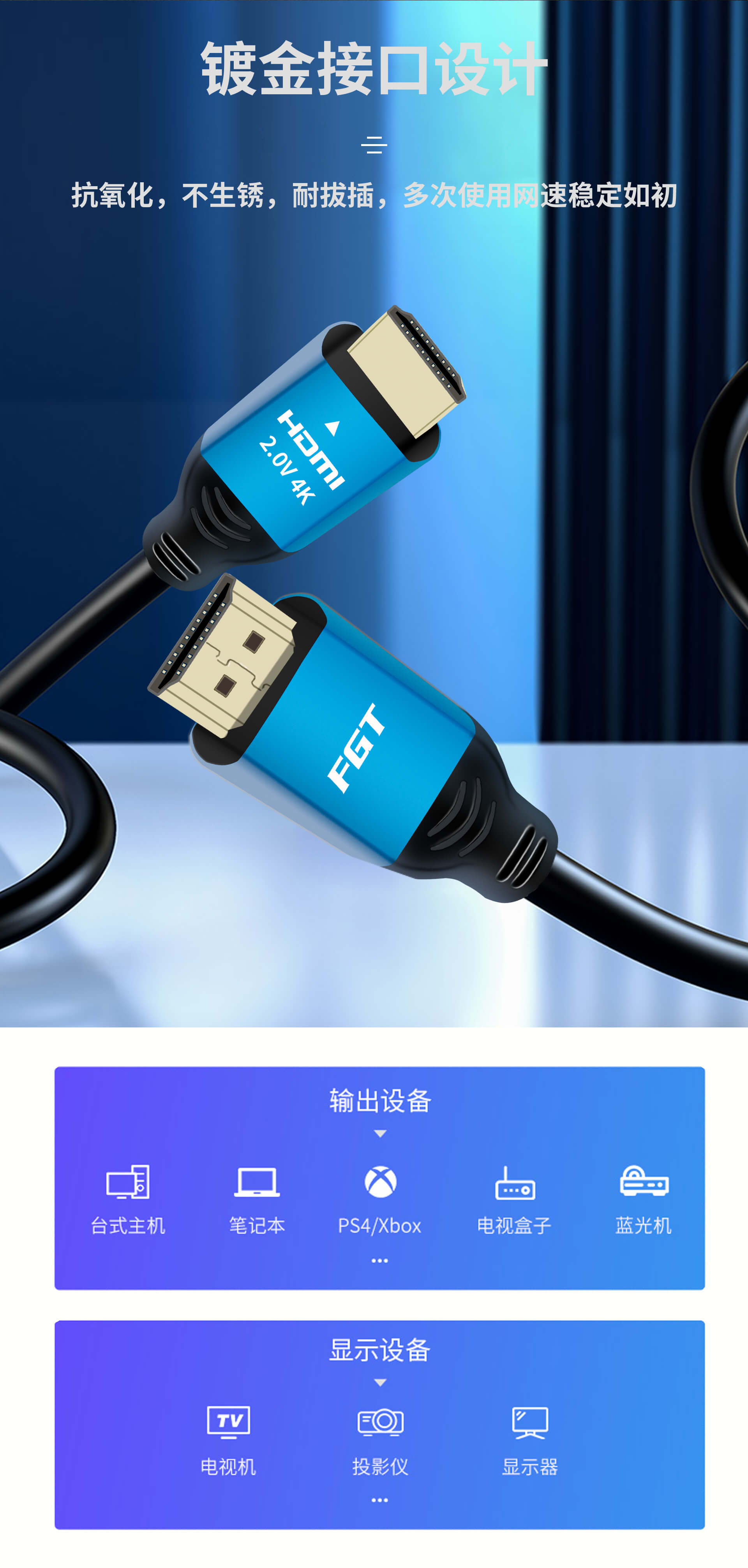FGT HDMI2.0高清線是一款4K超高清HDMI視頻連接線。HDMI線采用升級版HDMI2.0協議(yì),支持4K超清分(fēn)辨率,3D立體(tǐ)成像,HDR動态分(fēn)析,細節清清楚楚,還(hái)原真實世界;HDMI2.0高清線可(kě)用于大(dà)屏辦公會議(yì)、家庭超清影(yǐng)院,支持多屏鏡像和擴展模式,盡享大(dà)屏暢快(kuài)體(tǐ)驗。